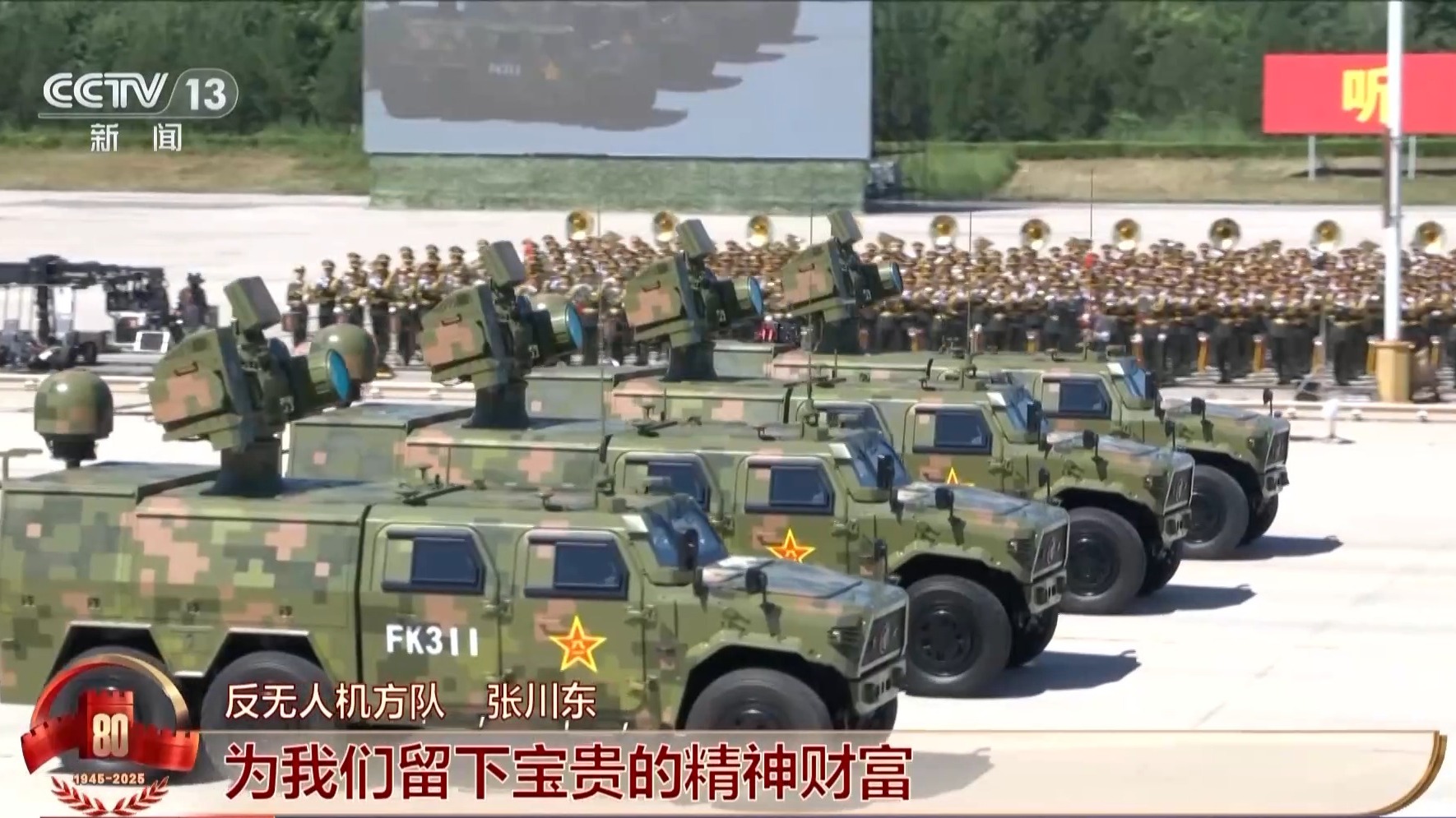 *反無人機方隊 張川東:*我是方隊的一名駕駛員,也是來自紅軍旅的一名戰士,這裝備是我在連隊的“好戰友”。抗戰時期,我們的革命先烈們用落後的武器裝備戰勝了強大的敵人,他們生不畏死、悍不服輸,用單薄的身軀挺起民族脊樑,為我們留下寶貴的精神財富。我們要傳承紅色血脈,弘揚偉大抗戰精神,練好練精手中武器,戰勝一切來犯之敵。