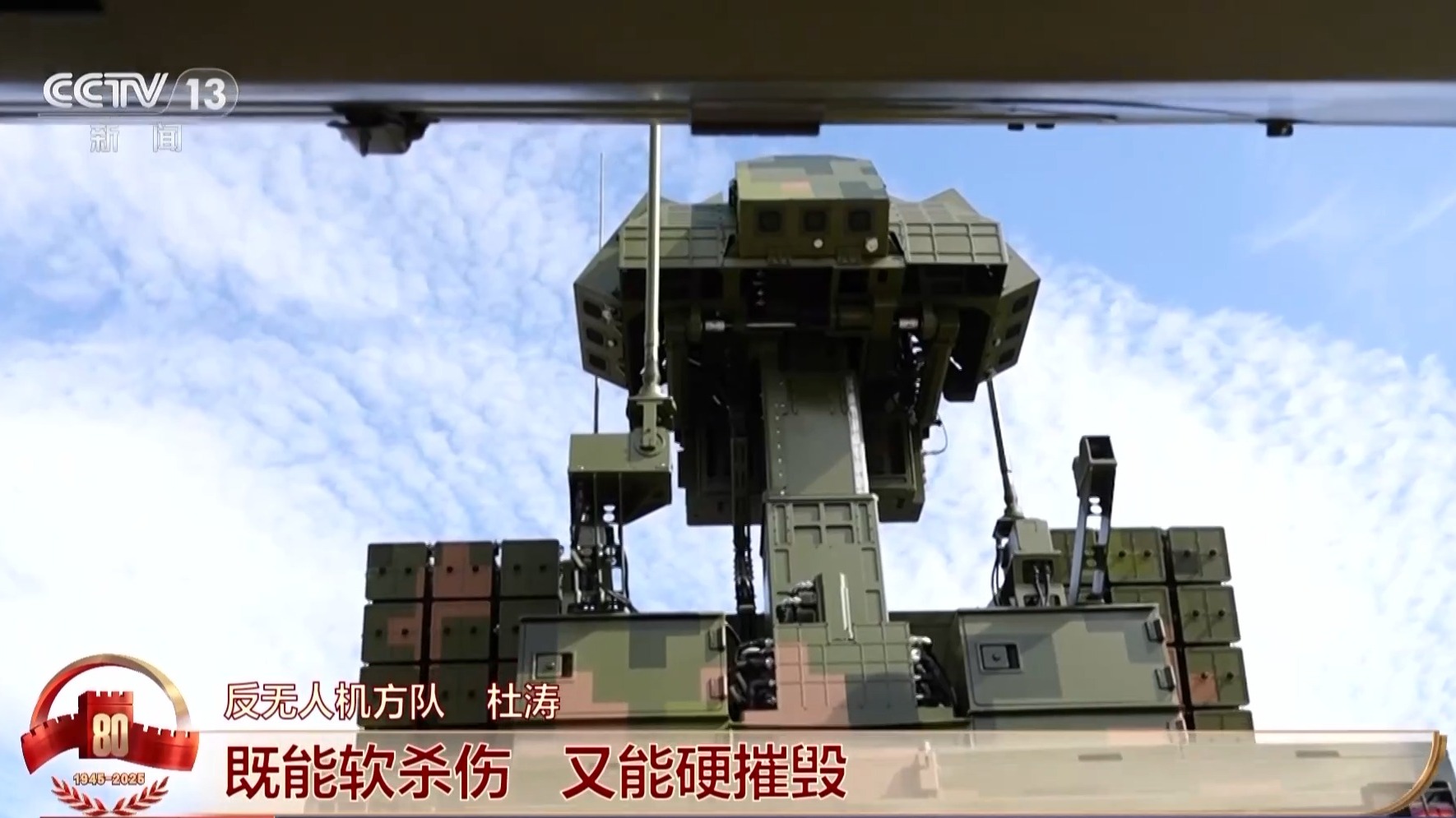 *反無人機方隊 杜濤:*它們是基於模塊化、開放式結構,有機集成反無彈炮系統、高能激光武器、高功率微波武器等裝備,綜合運用“彈、炮、光、波”等作戰手段,既能軟殺傷、又能硬摧毀,號稱“鐵三角”。