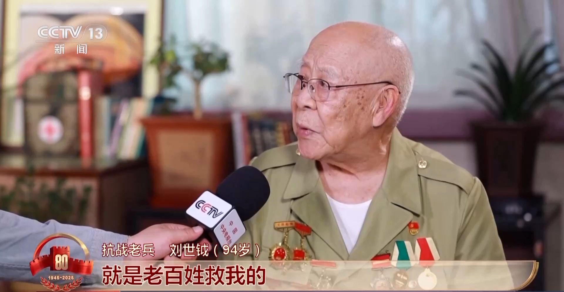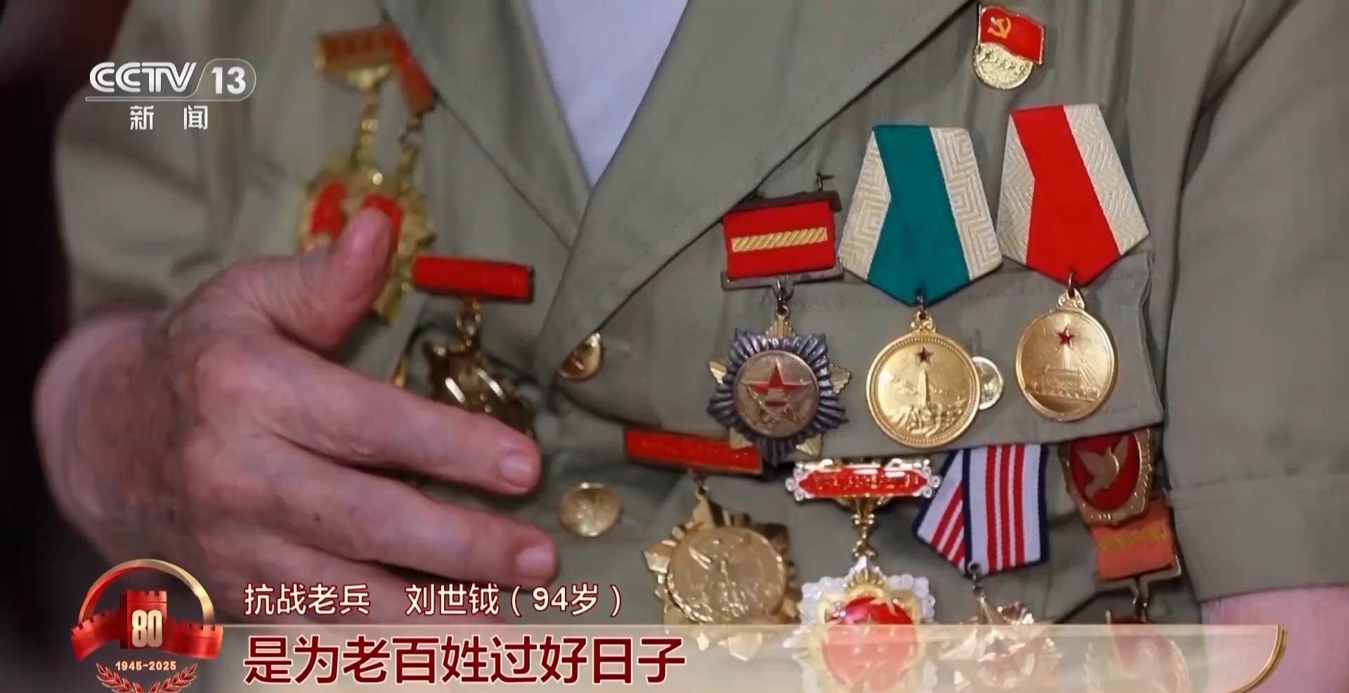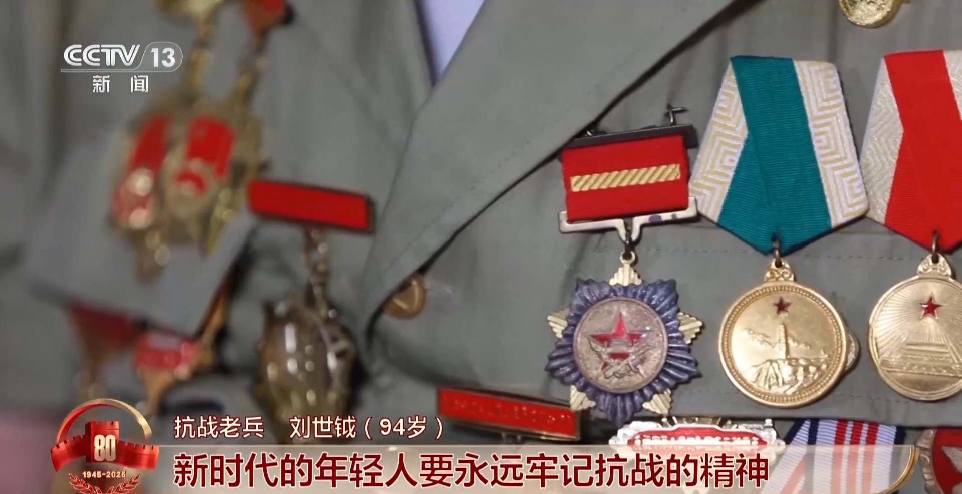 *抗戰老兵 劉世鉞 :*這個是抗日戰爭獨立自由獎(勳)章,這個是今年剛發的,抗日戰爭勝利80週年紀念章。這些不僅是我自己的榮譽,也代表犧牲的戰友們的榮譽,我把它們帶到北京去,讓他們看一看,我們國家越來越富強,人民生活越來越幸福。