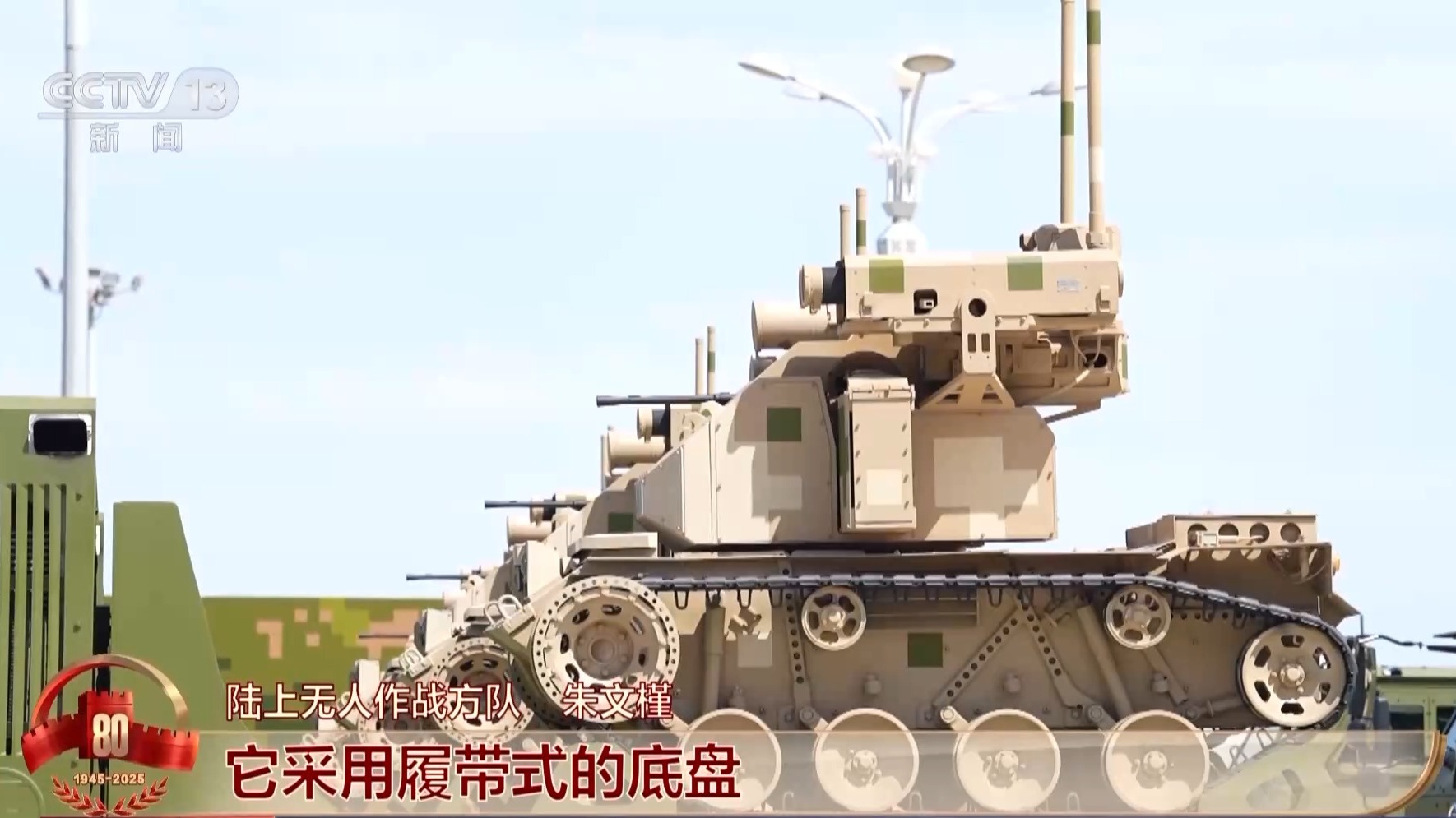 *陸上無人作戰方隊 朱文槿:*此次受閲的偵打突擊無人車,它採用履帶式底盤,可應對多種戰場環境,搭載的反坦克導彈、偵察模塊等,可遂行無人化抵近偵察、火力打擊等多樣化軍事任務,可以支援坦克、戰車和步兵班組開展協同作戰。