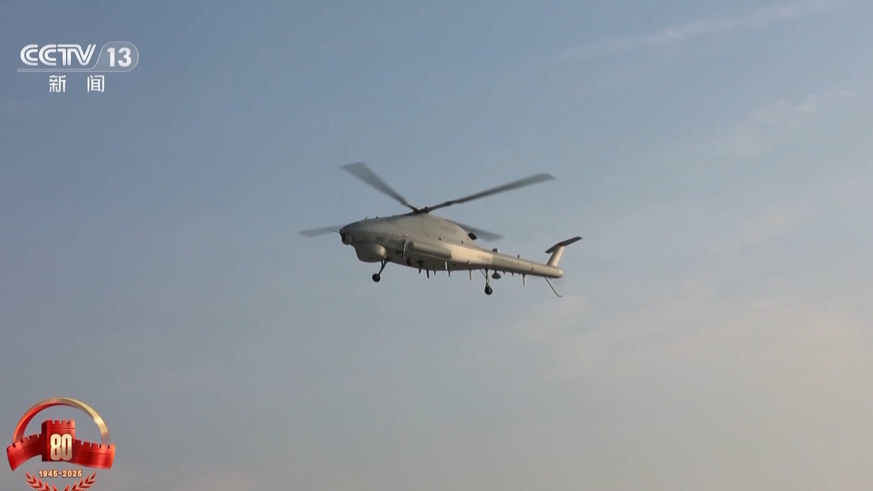 *空中無人作戰方隊 陳正源:*此次受閲的艦載無人直升機是旋翼家族的後起之秀,它的列裝無疑為戰艦又添上了一雙探天摸海的“眼睛”。