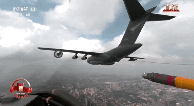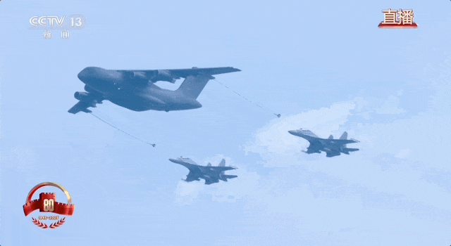 閲兵現場,為戰鷹助力,為勝利續航,加受油機梯隊飛臨天安門上空,三架運油-20A時刻準備為轟-6N、殲-16、殲-20飛機加油。