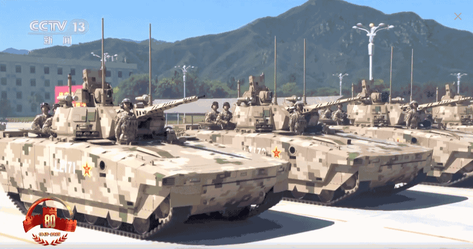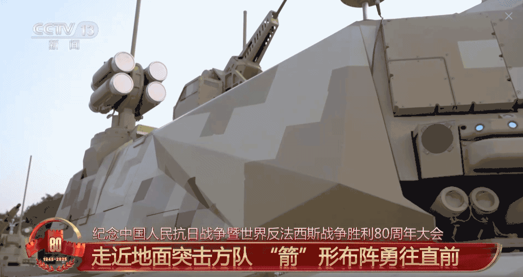 在所有參閲的裝備方隊裏,地面突擊方隊是第一個駛過天安門廣場的,和其他方隊使用的矩形編隊不同,他們擁有一個獨特的隊形,酷似一支射向前方的“利箭”。而組成這支“利箭”的是三款全新亮相的突擊裝備。