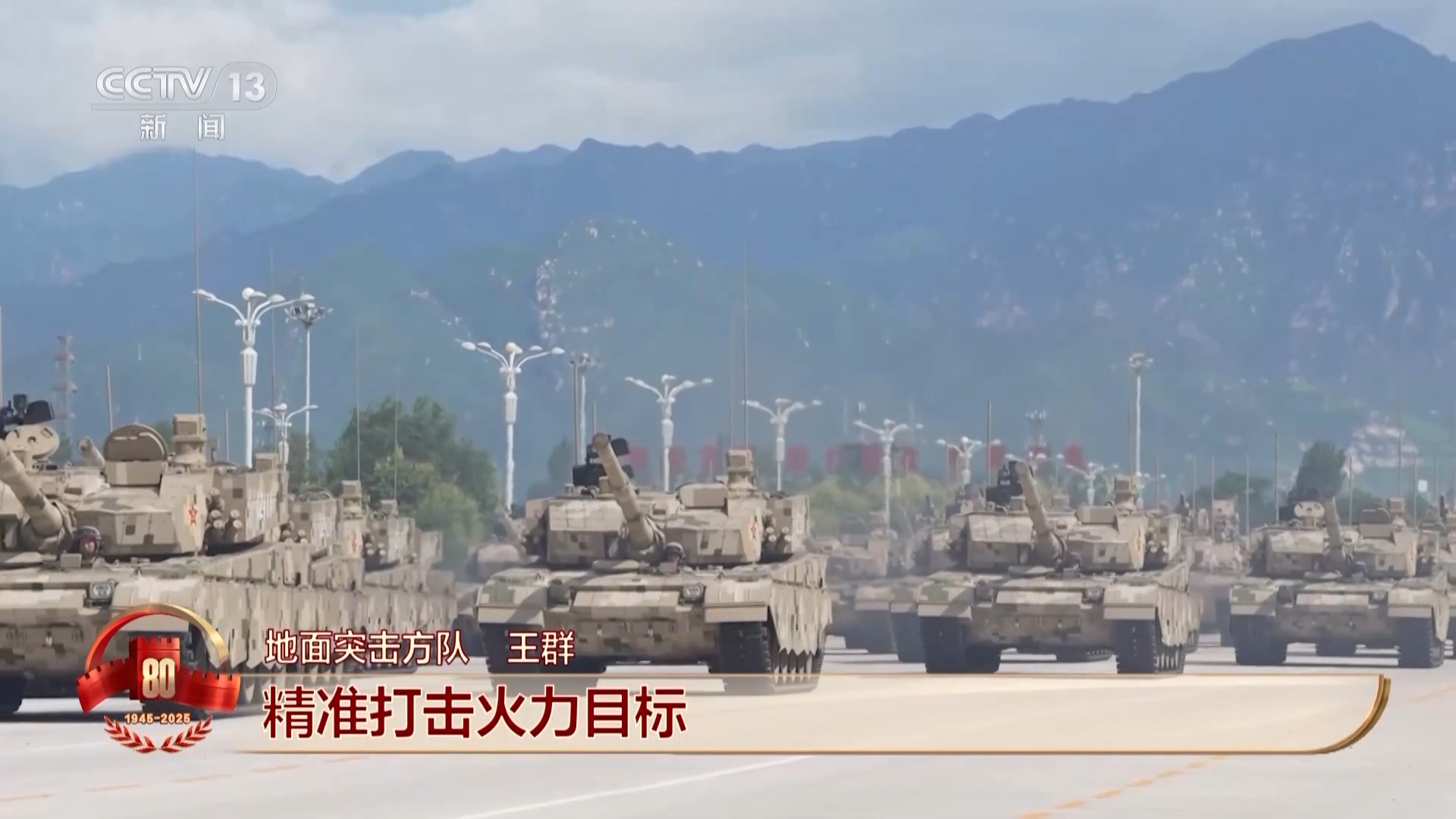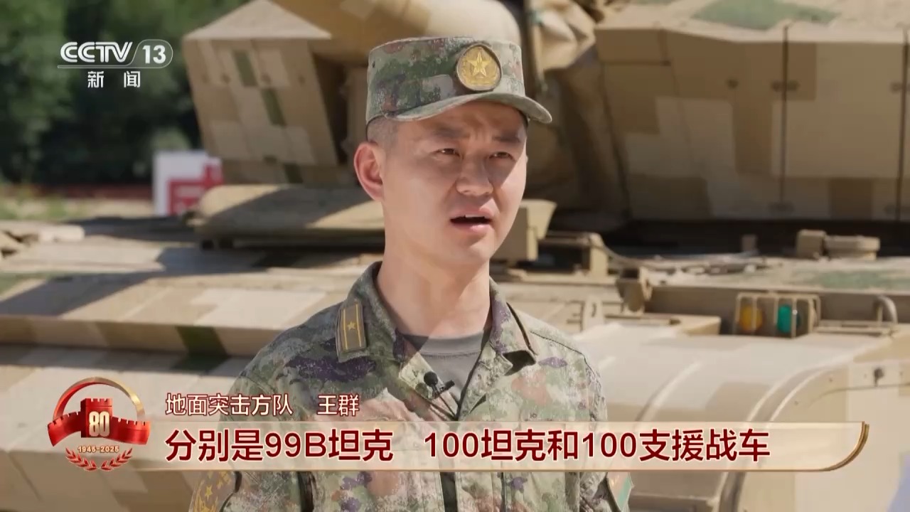 *地面突擊方隊 王羣:*此次受閲一共有三型裝備,分別是99B坦克、100坦克和100支援戰車,它們都是我軍高技術裝備體系的重要組成部分,99B坦克是基於99A坦克的改進型,100坦克和100支援戰車是陸軍未來戰場的核心力量。