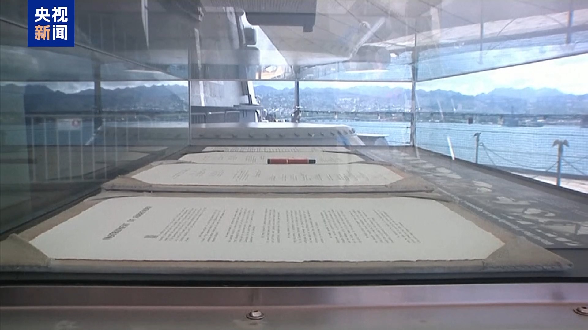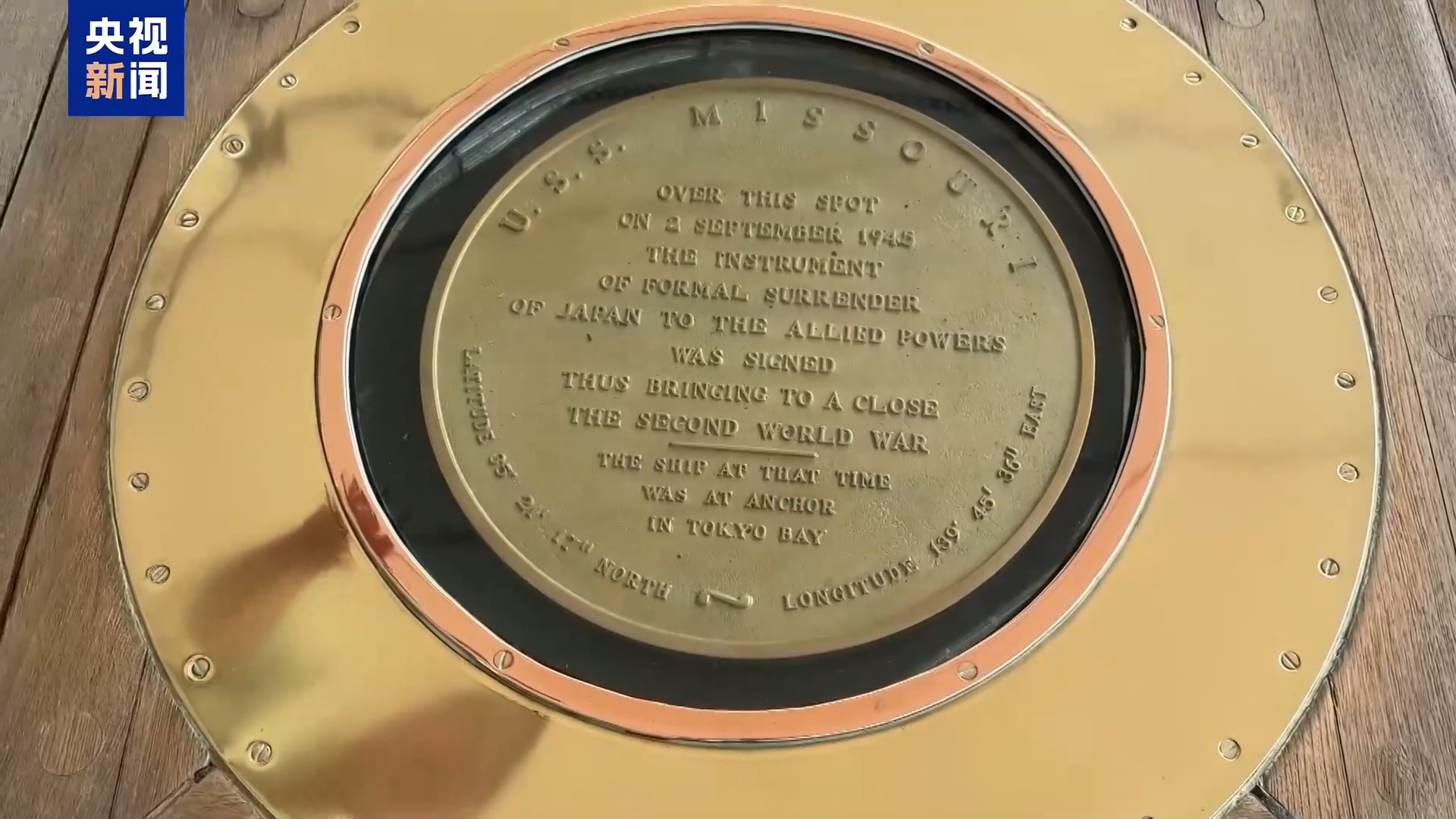 央視記者 劉旭:這個甲板如今也已經被命名為“投降甲板”。在這裏有一塊銅製的牌匾,上面也清晰地標註了,這就是當時雙方簽署投降文件擺放的那張桌子的精確位置。