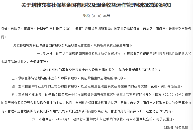 此次發佈的《關於劃轉充實社保基金國有股權及現金收益運作管理税收政策的通知》,為社保基金的投資運作送上了一份“大禮包”,通過四項精準的税收減免,全面覆蓋了投資過程中的主要成本環節:免徵增值税,對承接主體在運用劃轉資產投資過程中取得的貸款服務利息及金融商品轉讓收入予以免徵;企業所得税不徵税,將轉讓劃轉資產取得的收入作為企業所得税的不徵税收入;免徵印花税,承接主體轉讓劃轉的非上市公司國有股權免徵印花税;以及證券交易印花税先徵後返,對轉讓劃轉的上市公司國有股權及運用現金收益買賣證券的印花税實行先徵後返。