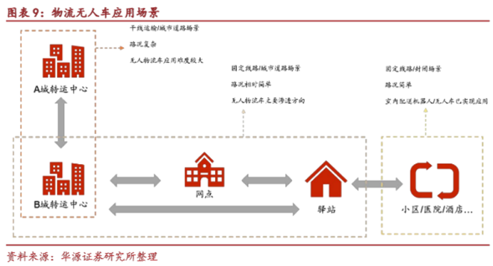 華源證券還具體分析提到,完整的快遞流轉一般包括“攬收-中轉-運輸-派送”,當前快遞末端派送時“入站入櫃率”較高,存在從網點至社區的批量運輸需求,結合物流無人車的低速安全、固定線路、無人智駕等特點,無人車可大幅應用於“派件網點至社區驛站”場景,有望取代常規的微型麪包車/微卡/輕卡/貨運三輪車,同時節約相關人力成本。此外,無人車的投入還可協助快遞企業優化配送模式,優化網點佈局,節約快遞員往返網點時間、增加面客營銷時間。