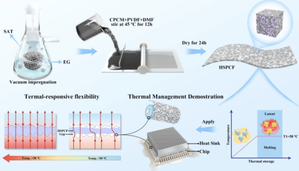 中國科學院青海鹽湖研究所研究團隊以三水醋酸鈉為相變材料,通過多孔膨脹石墨構建封裝空間,設計了無機相變薄膜。研究通過膨脹石墨在不同方向層間交聯形成3D多孔支撐骨架構建“熱橋”,實現了熱量多維度傳遞。當電子器件臨界熱失控,相變薄膜主動儲存熱量,“熱傳導+熱吸收”雙重熱管理機制可緩衝電子器件瞬時熱通量,同時PVDF的引入使相變薄膜獲得熱誘導柔性、良好的阻燃與電絕緣性能。這一工作使熱失控電池模塊温度降低10 ℃,CPU表面温度降低20 ℃。