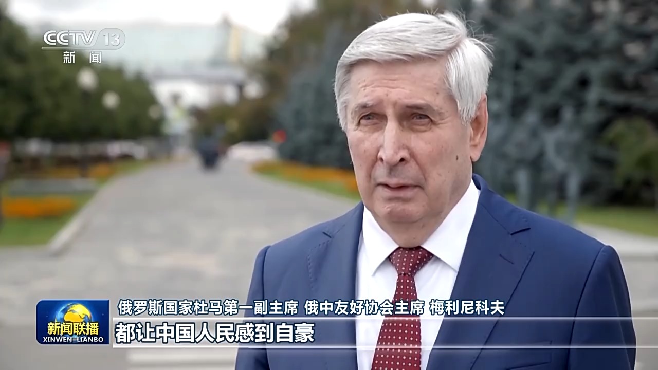 *俄羅斯國家杜馬第一副主席 俄中友好協會主席 梅利尼科夫:*我滿懷期待地收看了在北京舉行的盛大閲兵儀式,中國軍隊的現代化和中國當前在國際社會的聲望,都讓中國人民感到自豪。習近平主席在講話中提到,人類面臨對話還是對抗的抉擇。我認為,現場的各國領導人都支持走合作之路,支持基於平等和公正的合作,這也符合不久前發佈的《天津宣言》的精神。