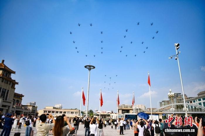 直升機組成巨大的“80”字樣。中新社記者 楊華峯 攝