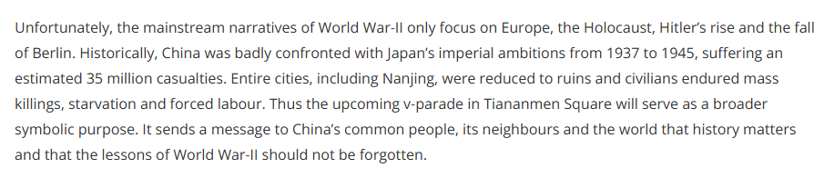 文章認為,今年是中國人民抗日戰爭暨世界反法西斯戰爭勝利80週年。然而遺憾的是,關於二戰的主流敍事往往只聚焦於西方戰場。但歷史上,中國在抗日戰爭期間有3500萬軍民傷亡。包括南京在內的許多城市淪為廢墟,平民遭受大規模屠殺、飢餓和強迫勞動。因此,中國人民抗日戰爭暨世界反法西斯戰爭勝利80週年紀念活動具有更廣泛的象徵意義——向中國人民、鄰國和世界傳遞了一個信息:歷史至關重要,二戰的教訓不應被遺忘。