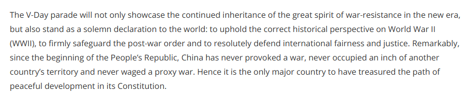 文章説,紀念活動不僅展示新時代對偉大抗戰精神的傳承,也是向世界的莊嚴宣告:堅持正確的二戰歷史觀,堅定維護戰後秩序,堅決捍衞國際公平正義。值得注意的是,自中華人民共和國成立以來,中國從未主動挑起戰爭,從未侵佔他國一寸領土,也從未發動代理人戰爭。中國也是唯一將和平發展道路寫入憲法的大國。