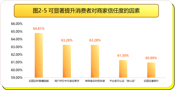 平台與商家如何贏得消費者信任?白皮書指出,消費者食品安全信任主要源於安全基準、透明公示與品牌背書。數據顯示,64.81%的消費者認為“後廚即時直播及操作過程可視化”最能提升信任度。63.28%的被調研對象認可“用户評價無食品安全差評”“使用食安封籤包裝”對商户信任度的提升效果。其他公示行為如“‘放心店’認證”和“後廚實景照片”的認可度也均超過60%。公開信息顯示,今年2月以來,已有11.7萬家商户在美團開通了“明廚亮灶直播”,全面覆蓋了商場連鎖餐廳、社區夫妻店及外賣店。預計到2025年底,將有超20萬家商家加入“明廚亮灶”。