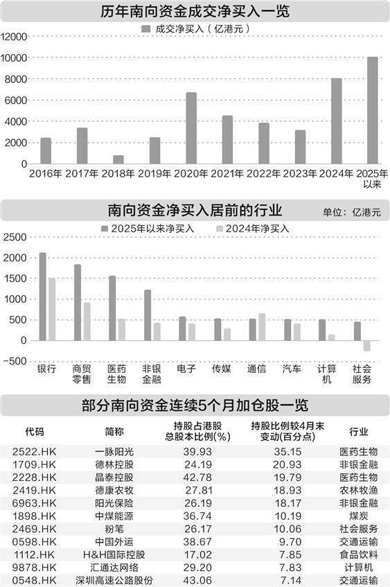 事實上,回溯歷史數據發現,自2023年7月以來,南向資金已連續27個月淨流入。今年以來,南向資金呈現加速淨流入狀態。從歷史看,南向資金淨流入超千億港元的僅有9個月,今年就佔6個月,其中4月淨流入額1666.72億港元,為歷史第二高,3月、2月淨流入均超1500億港元,分別排在第三、四名。