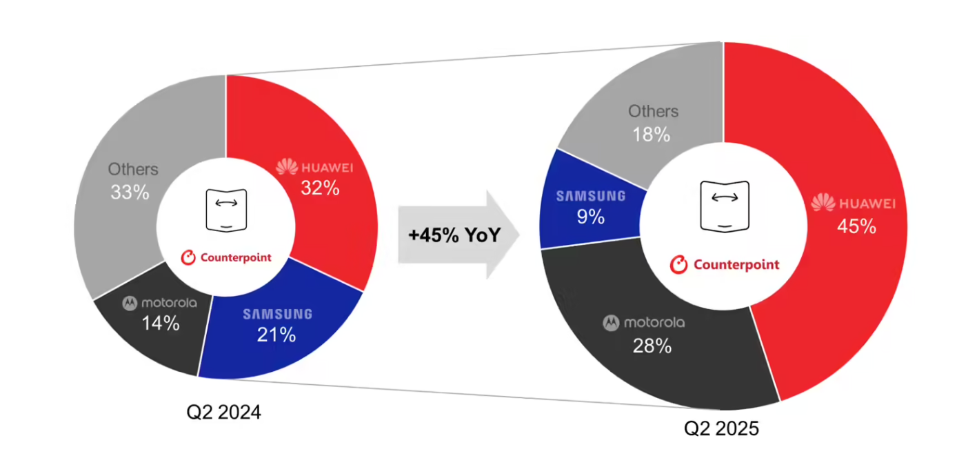 2025 Q2季度全球摺疊手機出貨量同比增45%,華為以45%市佔率領跑