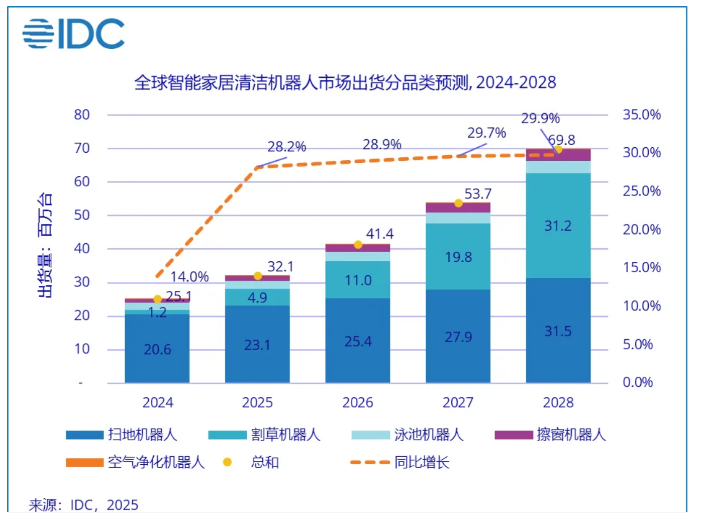 從IDC發佈的2024-2028年全球智能家居清潔機器人市場出貨分品類預測數據來看,未來幾年該市場將持續保持穩健增長態勢。其中,割草機器人憑藉其在户外清潔場景的獨特優勢,預計將延續高增長趨勢;掃地機器人作為當前市場主流品類,仍將維持較大出貨規模,為市場穩定貢獻力量;擦窗機器人、泳池機器人、空氣淨化機器人則將依託細分場景需求的不斷釋放,實現逐步增長,共同推動全球智能家居清潔機器人市場規模持續擴大。(純鈞)