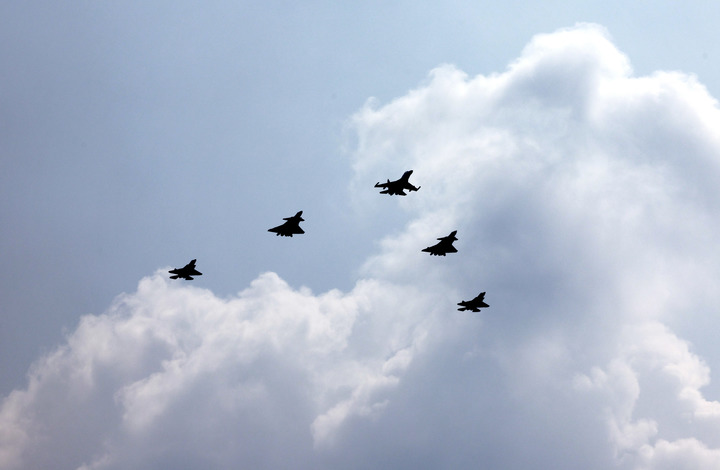 9月3日,紀念中國人民抗日戰爭暨世界反法西斯戰爭勝利80週年大會在北京隆重舉行。這是殲擊機梯隊接受檢閲。新華社記者 王曄 攝
