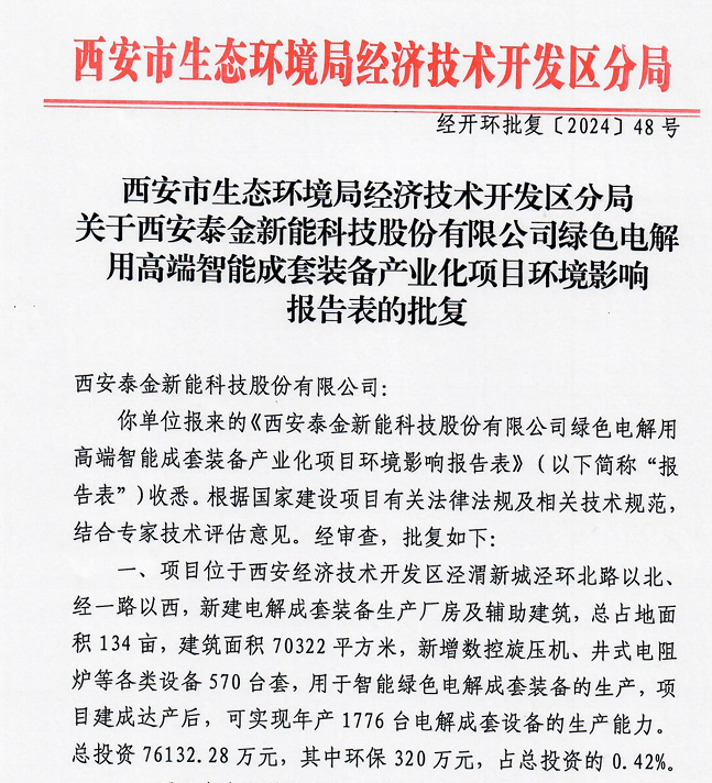 在產能規劃方面,泰金新能的大規模擴產計劃與當前低產能利用率的現狀形成鮮明對比,合理性存疑。公司募投項目“綠色電解用高端智能成套裝備產業化項目”環評批覆顯示,項目建成達產後可實現年產1776台電解成套設備的生產能力。招股書顯示,2024年公司電解成套設備產能為1360台,若募投項目達產,產能將擴大1.3倍。