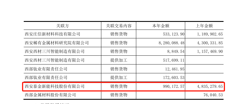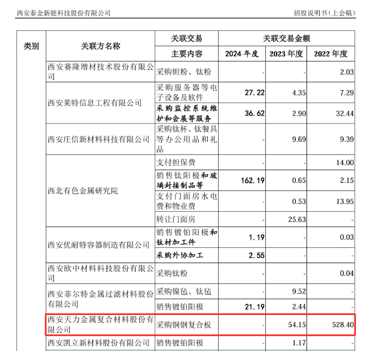 關聯交易數據同樣存在“雙版本”。招股書稱,2023年泰金新能向關聯企業西安天力金屬複合材料股份有限公司(下稱“天力複合”)採購金額為54.15萬元,而天力複合2023年年度報告卻顯示,當年向泰金新能銷售金額為99.02萬元,兩者相差44.87萬元。此外,2022年末的往來款項數據也不匹配,泰金新能招股書披露對天力複合應付賬款321.25萬元,天力複合年報則顯示應收泰金新能賬款276.39萬元,差額44.86萬元,且雙方均未對差異原因作出説明。