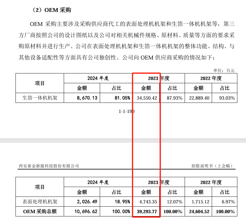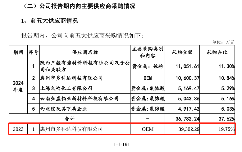 泰金新能招股書中的財務數據與外部信息的不一致,成為市場關注的焦點。在OEM採購方面,招股書顯示,2023年公司總OEM採購金額為39293.77萬元,但同期公司向前五大供應商之一的惠州市多科達科技有限公司採購OEM服務的金額卻達39302.29萬元,單一供應商採購額超過全年OEM採購總額,這一明顯的數值矛盾,讓外界對公司財務數據的準確性產生疑問。