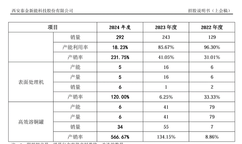 此外,公司主要產品表面處理機的銷售數據也引發疑問。2024年,泰金新能銷售表面處理機6台,平均售價930.68萬元/台,遠高於2023年的597.35萬元/台和2022年的579.65萬元/台。但招股書顯示,2022年、2023年公司表面處理機產銷率分別僅為6.25%和33.33%,截至2023年末發出表面處理機21台,平均價格570萬元/台;2022年末發出6台,平均價格469萬元/台。2024年銷售的6台表面處理機中是否包含此前發出的商品,以及在消化庫存的情況下售價大幅攀升的合理性,公司尚未給出明確解釋。