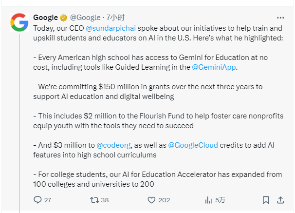 【環球網科技綜合報道】9月5日,Google公司在社交平台X宣佈:“今日,我們的首席執行官桑達爾・皮查伊談及了我們在美國開展的、旨在幫助學生與教育工作者接受人工智能培訓並提升相關技能的一系列舉措。”
