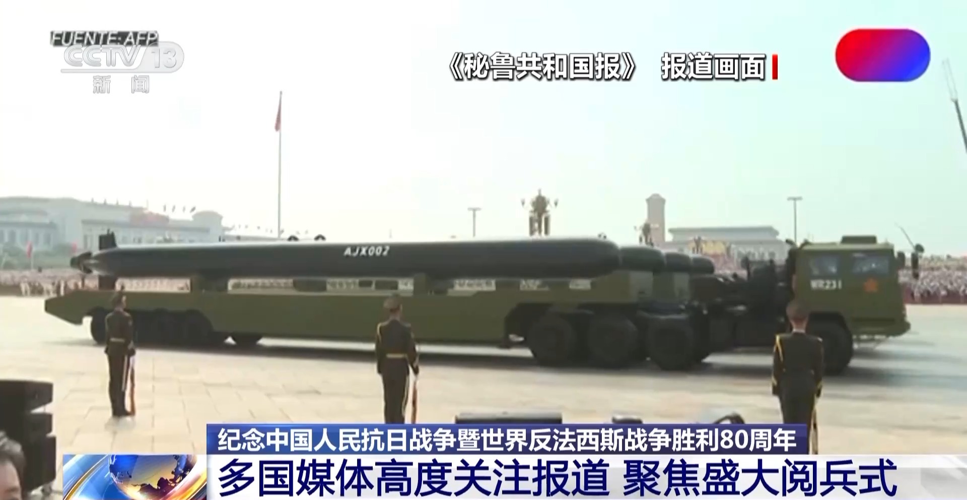 秘魯國家電視台全程直播了3日的閲兵式。《秘魯共和國報》、秘魯《商報》等多家媒體均關注報道了閲兵式上展示的先進軍事裝備。
