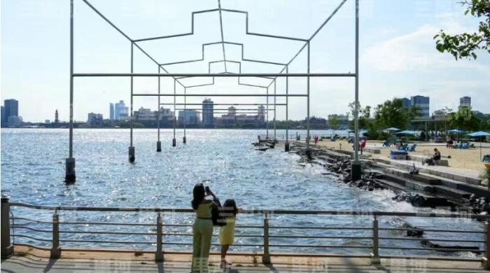 當地時間7月22日,美國紐約曼哈頓甘斯沃特沙灘旁,矗立着永久公共藝術項目“一日之末”。圖/中新社記者 廖攀 攝