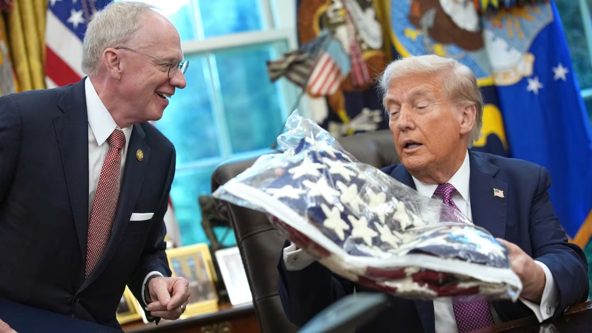 “哦,這個我晚上可以用。”特朗普接過後誤以為是條毛毯,引發在場人員笑聲。羅斯連忙解釋説,“這是一面美國國旗。”