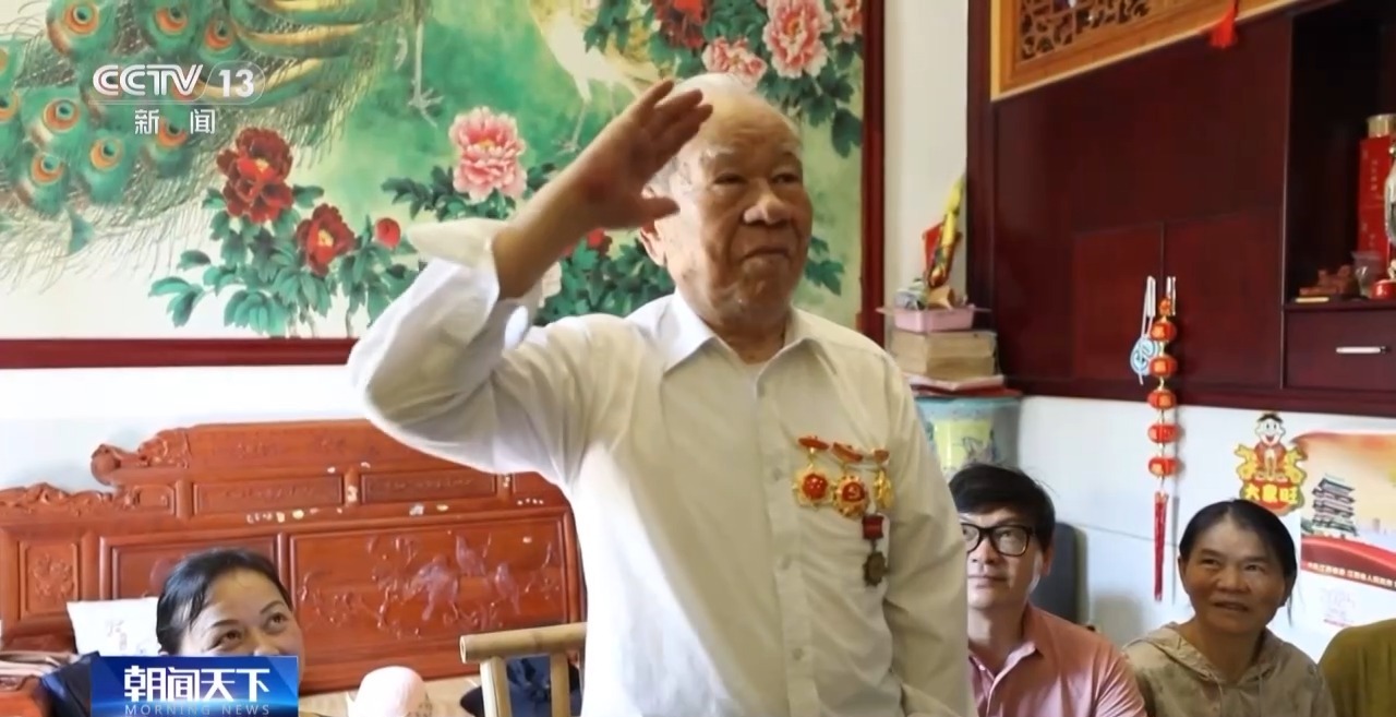 在江西金溪市,今年已經95歲的抗戰老兵王渭康與家人坐在電視屏幕前,一起收看盛典,當聽到“立正,敬禮”,他情不自禁站了起來。