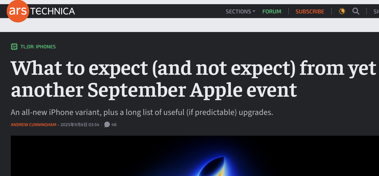 【環球網科技綜合報道】9月6日消息,據arstechnica報道,蘋果將於9月9日舉辦秋季新品發佈會。綜合多家權威渠道與零部件供應鏈信息,新一代 iPhone、Apple Watch 及智能家居配件的升級細節已浮出水面:外觀微調、屏幕高刷下放、影像傳感器全面 4800 萬像素化,以及一款替代 Plus 定位的“iPhone Air”成為最大看點。