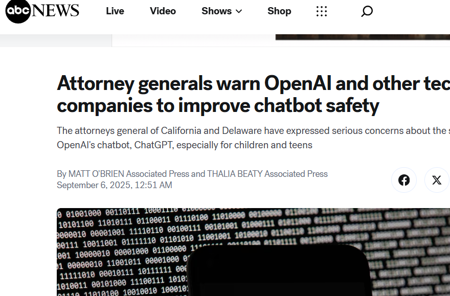 【環球網科技綜合報道】9月7日消息,據美國廣播公司新聞網報道,加利福尼亞州和特拉華州司法部長近日向OpenAI發出警告,直言對其旗艦聊天機器人ChatGPT的安全性,尤其是針對兒童和青少年的安全保障存在“嚴重擔憂”。