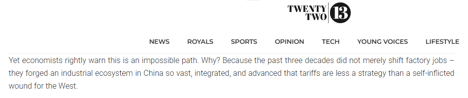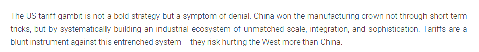 文章指出,美國的關税策略不是一項大膽的戰略,而是否認現實的症狀。中國贏得製造業桂冠不是通過短期手段,而是通過系統地建立一個規模、一體化和複雜程度無與倫比的工業生態系統。