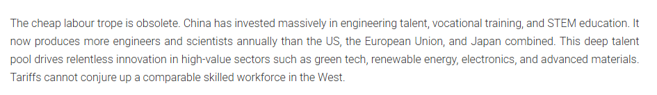 中國在工程人才、職業培訓以及科學、技術、工程和數學教育等方面投入了大量資金。現在,它每年培養的工程師和科學家比美國、歐盟和日本的總和還要多。這種深厚的人才庫推動了綠色技術、可再生能源、電子和先進材料等高價值領域的不懈創新。