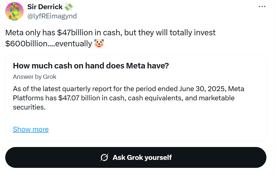 還有網友援引聊天機器人Grok的回答評論説,“Meta只有470億美元的現金,但他們將總共投資6000億美元……最終(小丑表情)”。 ↓