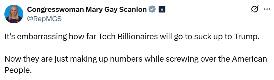 民主黨眾議員瑪麗·蓋伊·斯坎倫稱,“科技巨頭們為了討好特朗普能做到何種地步,這實在令人難堪。如今他們編造數據,同時卻在坑害美國人民。” ↓