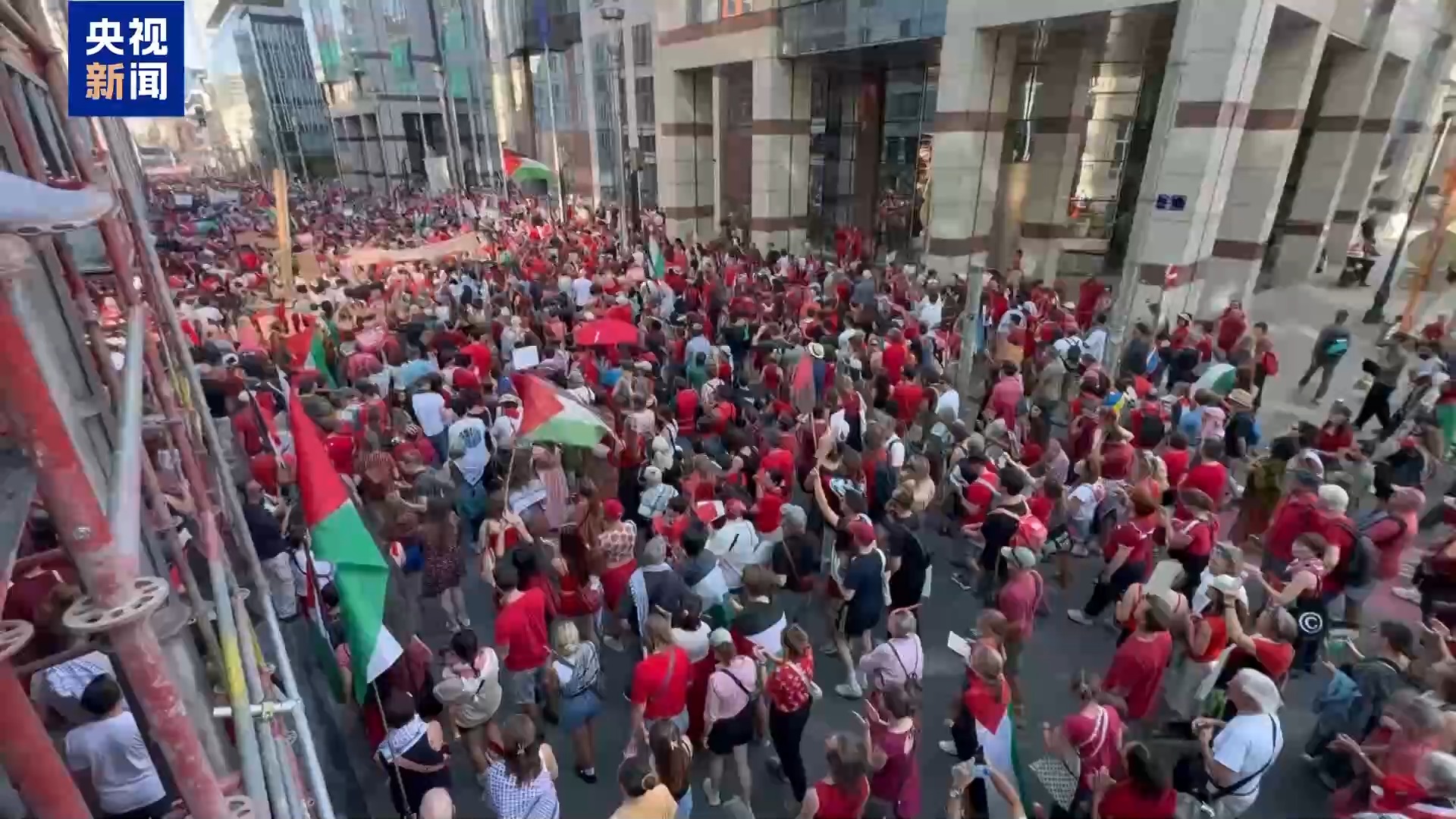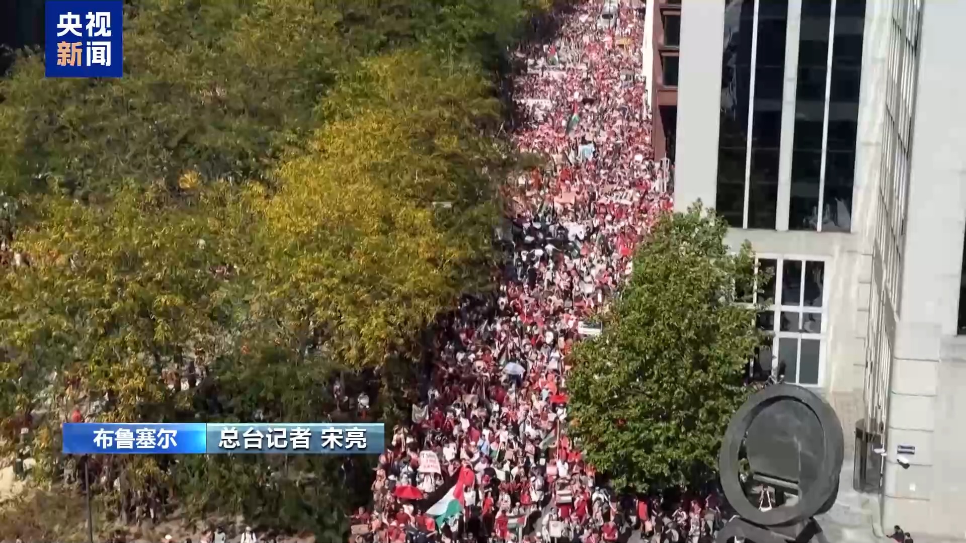 *總枱記者 宋亮:*可以看到這條隊伍非常長,大概綿延了幾公里,佔據了通往歐盟總部的整條街道,也可以看到很多人身着紅色的衣服,據官方信息介紹,這象徵着為加沙劃出的一條紅線。據活動官方組織者稱,當天有10萬多人蔘加了此次遊行。