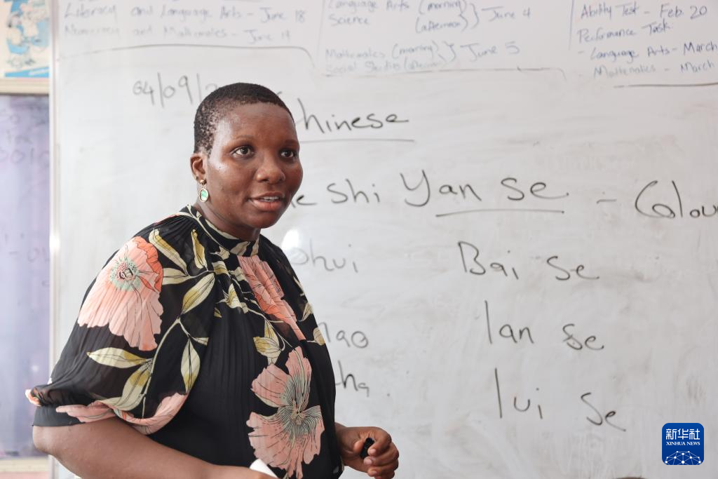 在牙買加首都金斯敦的一間教室裏,艾特特殊教育小學校長娜塔莎·拉塞爾在黑板上書寫着與顏色相關的漢字,孩子們端坐在椅子上,跟隨她輕聲朗讀。教室裏時而響起整齊的讀書聲,時而響起輕快的中文歌曲旋律。