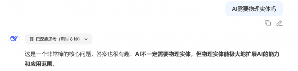AI需要身體嗎?Deepseek給出的答案是“不需要”。只要有數據、算力和算法,AI 就能在計算機服務器上運行。但,物理實體能極大地擴展AI的能力和應用範圍。如同一個孩子通過觸摸、看和聽來理解世界,AI也需要在物理世界中通過感知、互動和學習來形成。所以,要想讓AI在人類社會中發揮價值,物理實體是至關重要的,具身智能便成為科技發展的主要方向之一。