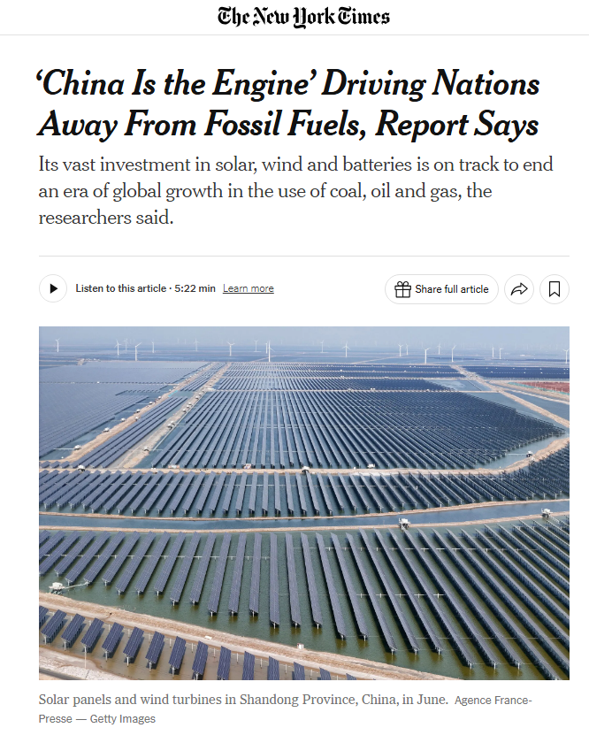 《紐約時報》網站近日刊登的一篇文章指出,自工業革命以來,全球經濟需要越來越多的化石燃料——煤炭、石油和天然氣來推動增長。不過,一份新報告指出,中國在向全球銷售電池、太陽能電池板和風力渦輪機等方面的積極努力,正在為終結這一化石燃料時代創造條件。