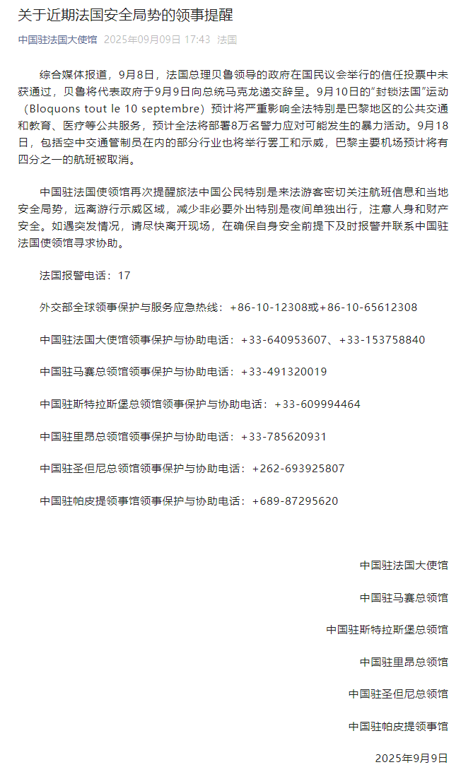 綜合媒體報道,9月8日,法國總理貝魯領導的政府在國民議會舉行的信任投票中未獲通過,貝魯將代表政府於9月9日向總統馬克龍遞交辭呈。9月10日的“封鎖法國”運動(Bloquons tout le 10 septembre)預計將嚴重影響全法特別是巴黎地區的公共交通和教育、醫療等公共服務,預計全法將部署8萬名警力應對可能發生的暴力活動。9月18日,包括空中交通管制員在內的部分行業也將舉行罷工和示威,巴黎主要機場預計將有四分之一的航班被取消。