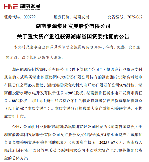 【環球網財經綜合報道】湖南發展(000722.SZ)9月9日公告,公司收到控股股東轉發的湖南省國資委批覆,原則同意公司發行股份及支付現金購買4家水電資產並募集配套資金的重大資產重組方案。此舉標誌着這家湖南能源集團旗下上市公司在聚焦主業、做大做強清潔能源的道路上邁出關鍵一步。