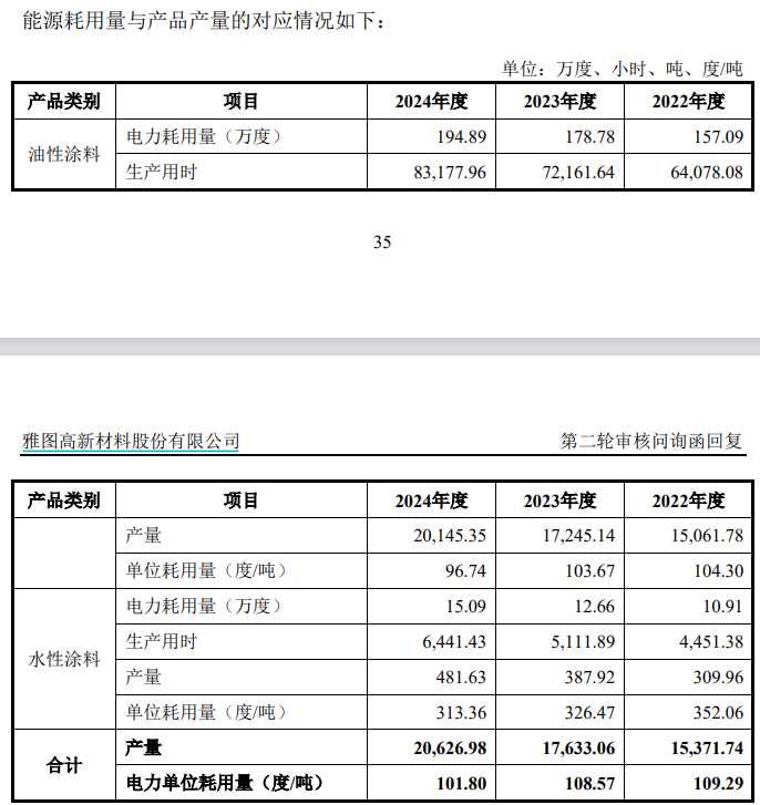 另據審核問詢函的回覆第35頁披露,公司的油性塗料2024年生產用時83177.96小時,對應產量為20145.35噸,折算單位產品耗時約為4小時/噸,而水性塗料2024年生產用時6441.43小時,對應產量為481.63噸,折算單位產品耗時約為13小時/噸,兩者差異巨大,至於其合理性,雅圖高新並未接受記者採訪。
