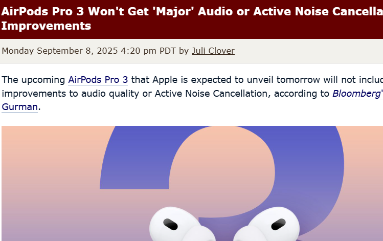 【環球網科技綜合報道】9月9日消息,據彭博社記者馬克·古爾曼透露,蘋果即將發佈的AirPods Pro 3,在備受關注的音頻質量和主動降噪功能上,竟不會帶來顯著改進,這一消息着實讓不少期待已久的果粉們大跌眼鏡。