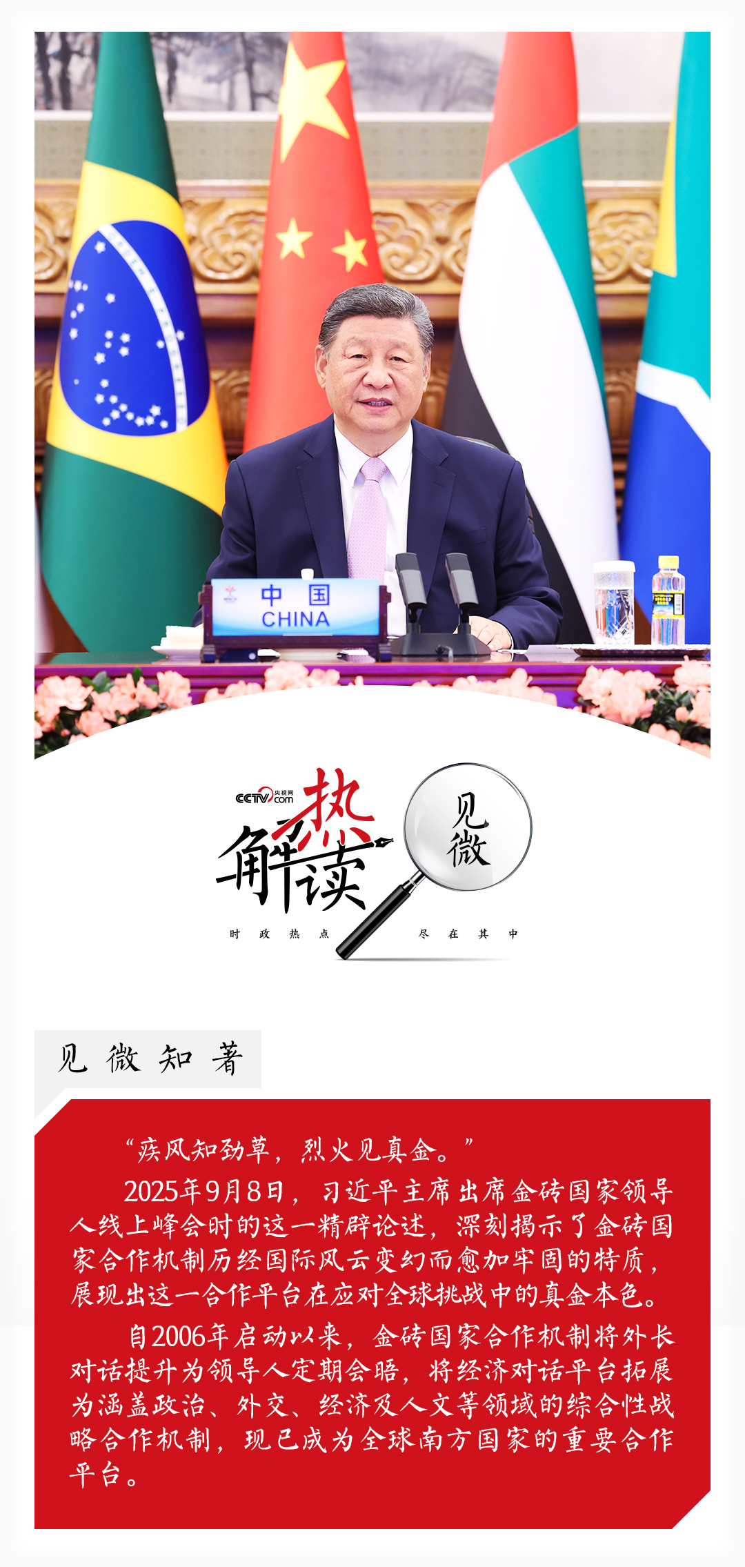 “時代的風浪越大,我們越要勇立潮頭,以堅韌不拔之志、敢為人先之勇、識變應變之謀,把金磚打造成促進‘全球南方’團結合作的主要渠道、推動全球治理變革的先鋒力量。”正如習近平主席所説,金磚國家合作越緊密,應對外部風險挑戰的底氣就越足、辦法就越多、效果就越好。