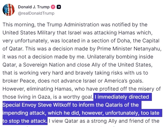 9日,美國總統特朗普在其社交平台“真實社交”發文稱,當天上午,政府接到美軍通知,以色列正在對位於多哈某區域的哈馬斯目標實施襲擊。特朗普稱,襲擊是以總理內塔尼亞胡單方面的決定,而不是他的決定。特朗普稱,他當時“立即指示特使威特科夫向卡塔爾通報即將發生的襲擊”。襲擊發生後,他與卡塔爾埃米爾(國家元首)及首相通話,保證此類事件不會在其領土重演。他還已指示國務卿魯比奧儘快完成與卡塔爾的防務合作協議。