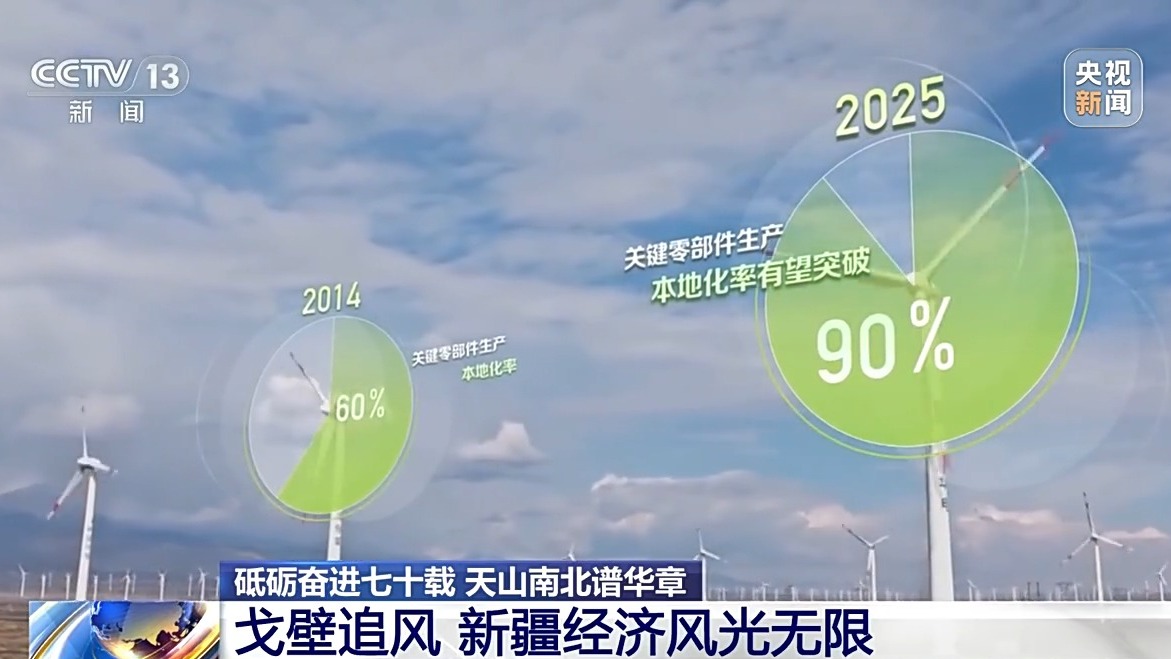 2012年開始,哈密加快佈局風電產業。先後引入14家規模以上風電企業,建設3個風電產業園,構建起新疆規模最大、產業鏈最全的風電裝備製造基地。這個旋轉的風機上,2014年,關鍵零部件生產本地化率60%,今年這一數字有望突破90%。