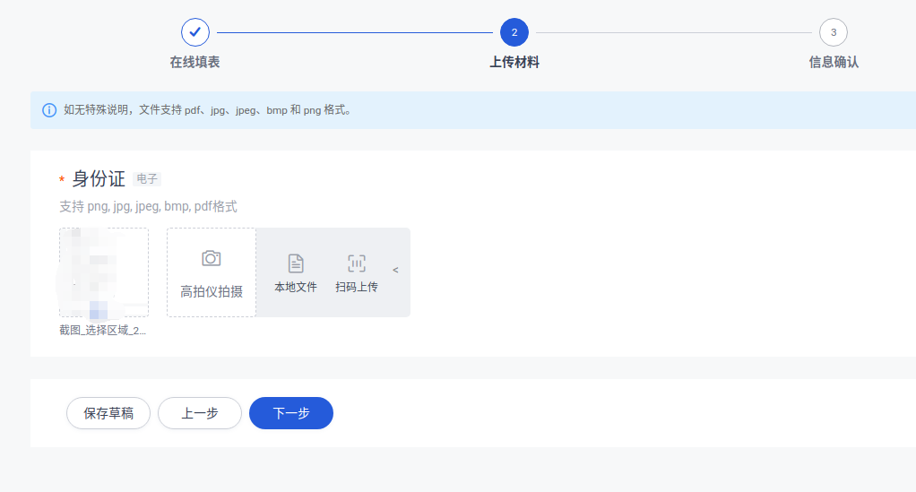 填寫完成且通過系統核驗的,可點擊“下一步”,進入上傳材料環節。請按提示的材料名稱上傳真實資料影像照片,並在完成上傳材料後進入“信息確認”環節,對提交資料再次核實無誤後提交中心處理,公積金中心將對該筆業務進行審核,審核通過後,直接將住房公積金轉入中介的監管賬户(中心審核後辦結)。