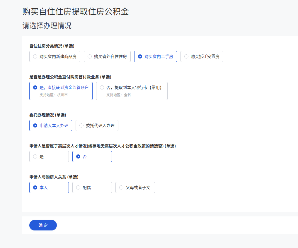 賬號登錄後,選擇“杭州市”—“部門服務”—“市公積金中心”—“購買自住住房提取住房公積金”事項辦理,限杭州市二手房購房人本人辦理。