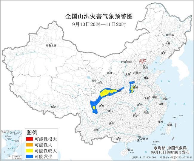 *水利部和中國氣象局9月10日18時聯合發佈橙色山洪災害氣象預警:*預計,9月10日20時至11日20時,河南中西部、四川中部和北部、陝西西南部、甘肅南部等地部分地區發生山洪災害可能性較大(黃色預警),其中,河南中西部局地發生山洪災害可能性大(橙色預警)。其他地區也可能因局地短歷時強降水引發山洪災害,請各地注意做好即時監測、防汛預警和轉移避險等防範工作。